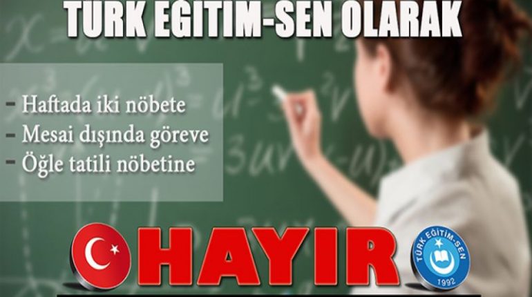 Türk Eğitim-Sen Genel Başkanı Talip Geylan’ın, sendikamız aldığı eylem kararları ile ilgili basın açıklamasıdır. GENEL BAŞKAN: “NÖBET GÖREVİ İLE İLGİLİ 4 AYRI EYLEM KARARI ALDIK.” Nöbet görevleri ne yazık ki suiistimale açıktır, bu görevi yerine getiren öğretmenlere angarya işler yüklenmektedir, hatta MEB nöbetçi öğretmenleri insan haklarına aykırı bir şekilde öğle arası vermeden çalıştırabilmektedir. Nöbet görevi […]
