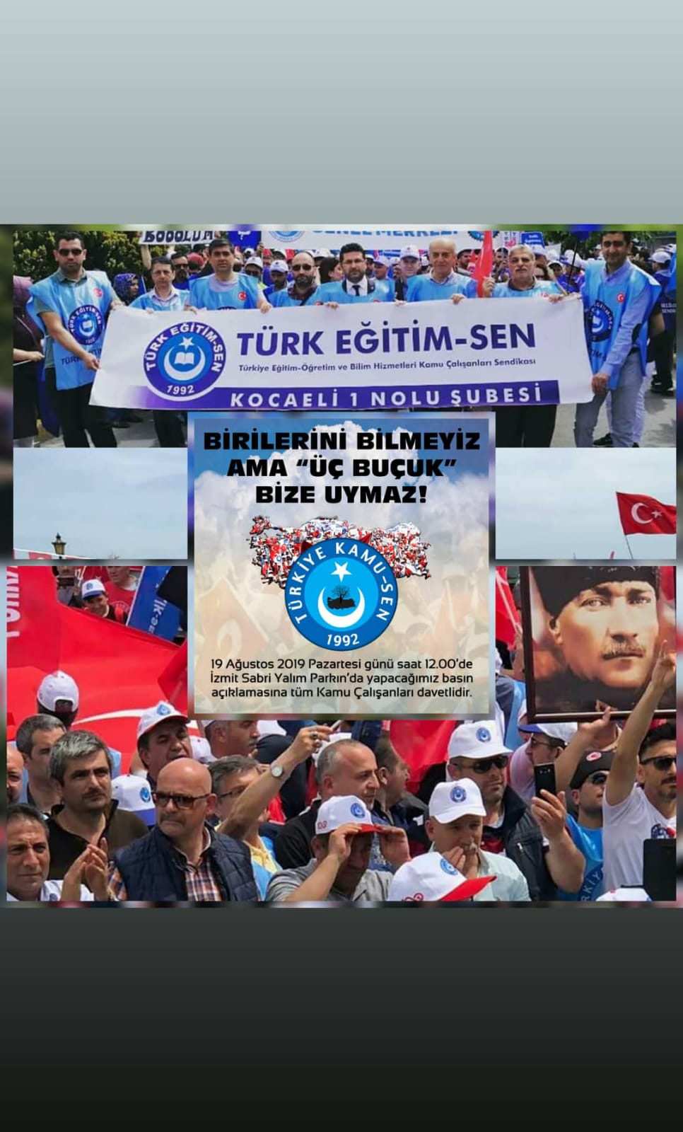 19 Ağustos 2019 Pazartesi günü saat 12.00’de İzmit Sabri Yalım Parkın’da basın açıklaması yaparak protesto edeceğiz.Bütün kamu çalışanlarını haklı isyanımıza destek olmaya, Hükümeti de akl-ı selime davet ediyoruz.